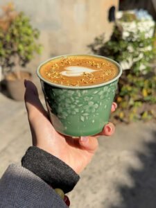 Blooming flowers (joy, growth, natural beauty) bring romantic, nature-connected charm to coffee rituals.