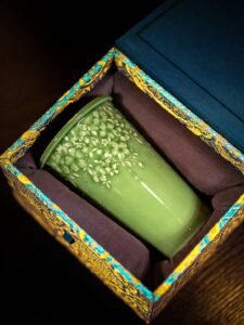 • How should I care for the porcelain cup?Handle with care. Avoid dropping, knocking against hard surfaces, or sudden temperature changes (e.g., pouring boiling water into a cold cup). Clean gently with a soft cloth or place it in the dishwasher. Do not use abrasive cleaners. The cup is safe for microwave use. Keep away from direct sunlight to preserve glaze color.